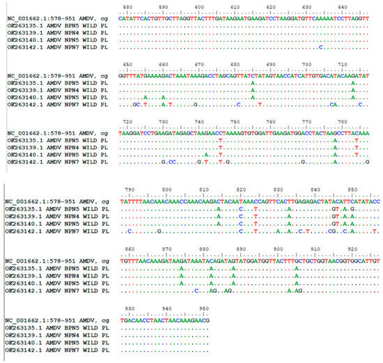 The isolates from the group were most similar to the isolates from first clade (group A) described previously by Kondracki et al. [24] and the sequences isolated in the USA—AMDV G (Acc. No. NC 001662); there is evolutionary divergence between the sequences of 5.80 and 6.86%, AMDV Utah (Acc. No. X77083), with an evolutionary divergence between sequences of 6.16 and 7.23%, and Germany, AMDV SL3 (Acc. No. X77085), with an evolutionary divergence between sequences of 6.16 and 7.23%. These variants also shared similarity with the nucleotide sequences isolated in Greece, AMDV isolate F8B5 F (Acc. No. MG366646.1), an evolutionary divergence between sequences of 7.23 and 7.59%, Latvia, AMDV A1 F (Acc. No. OR123963.1), an evolutionary divergence between sequences of 7.24%, and Poland, AMDV isolate ZP1b (I) F (Acc. No. MN175700.1), and an evolutionary divergence between sequences of 7.60%. The compared sequences were obtained from farmed mink.
