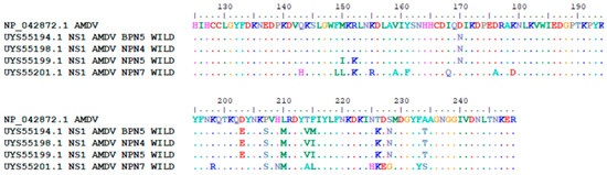 Amino acid (aa) substitutions in the NS1 protein of our AMDV variants were compared with the NS1 protein of AMDV G (Protein ID NP042872), as presented Figure 3.