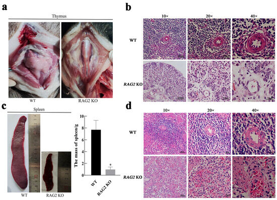 Effects of RAG2 gene knockout on thymus and spleen development. (a,b) The thymus gross and histomorphology of 1-month-old wild-type and RAG2 KO pigs. (c,d) The spleen morphology, mass and histomorphology of 1-month-old wild-type and RAG2 KO pigs. * p < 0.05 indicates a significant difference.