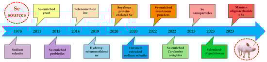 Historical timeline of selenium (Se) sources reported in the field of weaned piglet nutrition for the first time [,,,,,,,,,,,].