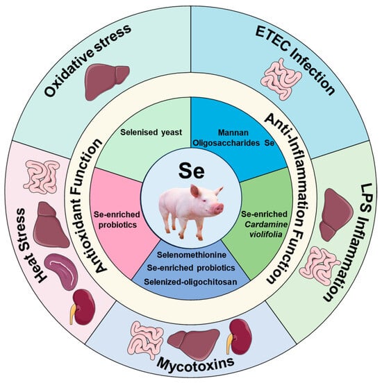 Oxidative stress is a significant indicator of weaning stress in piglets and has adverse effects on their growth performance and overall health []. Additionally, improper management practices, environmental stressors, feed oxidation, and pathogen infections have all been documented as factors that can induce or worsen oxidative damage in weaned piglets []. In an experimental model of diquat-induced oxidative stress, Se-enriched yeast was found to mitigate growth retardation in weaned piglets []. This effect was attributed to the augmentation of antioxidant capacity and immune functions, as well as the suppression of inflammatory response []. An emerging Se source, soybean protein-chelated Se, was also assessed for its mitigating effects on diquat-induced oxidative stress in weaned piglets []. Dietary supplementation with either 0.3 mg/kg Se as soybean protein-chelated Se or selenized yeast partially mitigated oxidative stress in weaned piglets, as observed in a diquat-induced oxidative stress model []. Specifically, dietary supplementation of soybean protein-chelated Se increased SOD activity in the plasma of piglets experiencing oxidative stress []. Moreover, the dietary supplementation of selenized yeast showed improvement in antioxidant capacity and immune function, as demonstrated by increased GSH-Px activity in both plasma and liver, as well as a decrease in lymphocyte count in the blood of piglets []. According to the findings of Doan et al., the additive effects of the evaluated Se sources under diquat-induced oxidative stress conditions are ranked as follows: selenized yeast > soybean protein-chelated Se > sodium selenite [].