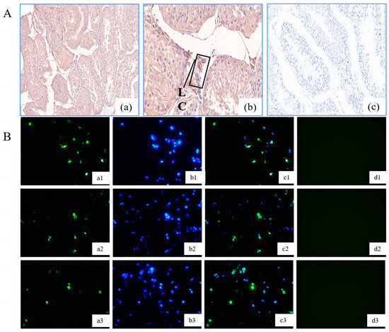 Localization of GLOD4 protein in 12-month-old testis tissue and Leydig cells. (A) Immunohistochemical staining of GLOD4 protein in the testes of a 12-month Qianbei Ma goat. (a) Immunostaining pattern of GLOD4 protein in the 12M testes (100×) of a Qianbei Ma goat. (b) Immunostaining pattern of GLOD4 protein in the 12M testes (400×) of a Qianbei Ma goat. LC, Leydig cell; (c) phosphate-buffered saline (PBS) was used instead of the primary antibody as a negative control (400×). (B) Subcellular localization of GLOD4 on the goat Leydig cells. GLOD4 was labeled with GFP fluorescence (a1–a3) and the nuclei were labeled with DAPI dye (b1–b3) (100×). c (c1–c3) Diagram combining a (a1–a3) + b (b1–b3); (d1–d3) blank control (n = 3).