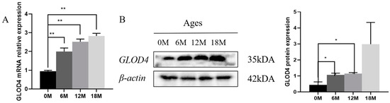 Expression of GLOD4 in testes at different months of age. (A) GLOD4 mRNA expression in testes of goats of different ages. (B) GLOD4 protein expression in testes of goats of different ages. Data are expressed as mean ± standard deviation, * p < 0.05; ** p < 0.01.