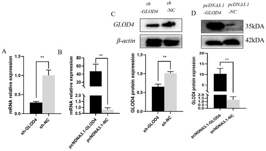 Validation of GLOD4 overexpression and silencing expression vector efficiency. (A,B) GLOD4 mRNA and protein expression levels in goat Leydig cells transfected with shRNA−GLOD4 and sh−NC. (C,D) GLOD4 mRNA and protein expression levels in goat Leydig cells transfected with pcDNA3.1−GLOD4 and pcDNA3.1−NC. Data are expressed as mean ± standard deviation, ** p < 0.01.