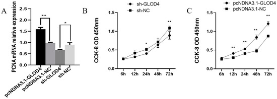 After GLOD4 silencing and overexpression, both the mRNA and protein levels of GLOD4 were significantly downregulated and upregulated (p < 0.01 each), respectively, compared to those in the control group (sh−NC, pcDNA3.1−NC) (Figure 3A–D). The CCK-8 assay at 6, 12, 24, 48 and 72 h after transfection, which revealed that silencing of GLOD4 inhibited the proliferation of Leydig cells, whereas GLOD4 overexpression significantly promotes cell proliferation. (Figure 3B,C). In addition, we found that GLOD4 interference and overexpression resulted in the downregulation and upregulation of PCNA, respectively (Figure 4A).