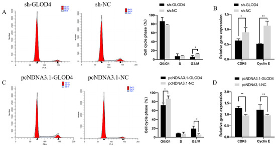 The percentage of cells in the G2/M phase was (p < 0.05) lower than that in the control group after GLOD4 silencing and expression of the cell cycle-regulated protein kinase (CDK6) and Cyclin E (Cyclin E) was significantly reduced in these cells (p < 0.05) (Figure 5A,B). In contrast, overexpression of GLOD4 significantly reduced the percentage of cells arrested in the G0/G1 phase and increased the percentage of cells in the G2/M phase compared to those in the control group, and highly significantly (p < 0.01) upregulated the expression levels of CDK6 and Cyclin E (Figure 5C,D).
