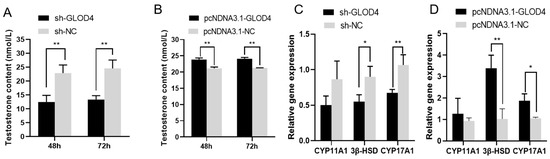 After GLOD4 silencing, it secreted less testosterone (p < 0.01) than that in the controls at 48 and 72 h, and the expression of 3β-HSD (p < 0.05) and CYP17A1 (p < 0.01) significantly decreased (Figure 6A,C). In addition, after overexpression of GLOD4, Leydig cells secreted (p < 0.01) more testosterone hormone than the control group at 48 h and 72 h, significantly increased expression of 3β-HSD (p < 0.01) and CYP17A1 (p < 0.05), and had no effect on CYP11A1 expression (Figure 6B,D).