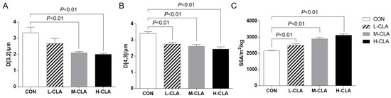The effects of CLA on milk fat globule size. (A) D[3,2]: surface area-related equivalent diameter; (B) D[4,3]: volume-related equivalent diameter; (C) SSA: specific surface area. CON: control group; L-CLA: low-dose CLA group; M-CLA: medium-dose CLA group; H-CLA: high-dose CLA group.