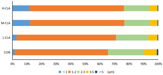 The effects of conjugated linoleic acid (CLA) on milk fat globule (MFG) size proportions. H-CLA: high-dose CLA group; M-CLA: medium-dose CLA group; L-CLA: low-dose CLA group; CON: control group.