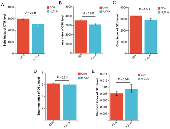 Comparative analysis of ruminal bacteria alpha-diversity between the control (CON) and high-dose conjugated linoleic acid (H-CLA) groups. (A) Sob index, (B) ACE index, (C) Chao index, (D) Shannon index, (E) Simpson index.