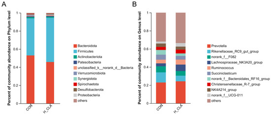 The relative abundance of ruminal bacteria at the phylum (A) and genus (B) levels in the control (CON) and high-dose conjugated linoleic acid group (H-CLA) groups.