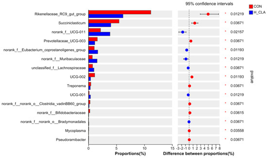 At the genus level, there were significant differences in the abundance of 21 bacterial genera between the H-CLA group and the CON group (Figure 6 shows the relative abundance of the top 15 genera), most of which belonged to the phyla Bacteroidetes and Firmicutes. As shown in Figure 6, the relative abundance of Rikenellaceae_RC9_gut_group (Bacteroidetes) and UCG-002 (Firmicutes) in the CON group was almost twofold and threefold higher, respectively, than that in the H-CLA group. Meanwhile, the relative abundance of Succiniclasticum and norank_f__norank_o__Clostridia_vadinBB60_group in Firmicutes, Prevolellaceae_UCG-003 in Bacteroidetes, and Treponema in Spirochaetota was significantly higher in the CON group than in the H-CLA group. Moreover, the relative abundance of norank_f__UCG-011, norank_f_Eubacterium_coprostanoligenes_group, unclassified_f__Lachnospiraceae, and UCG-001 in Firmicutes and norank_f__Muribaculaceae in Bacteroidetes in the H-CLA group was significantly higher than that in the CON group.