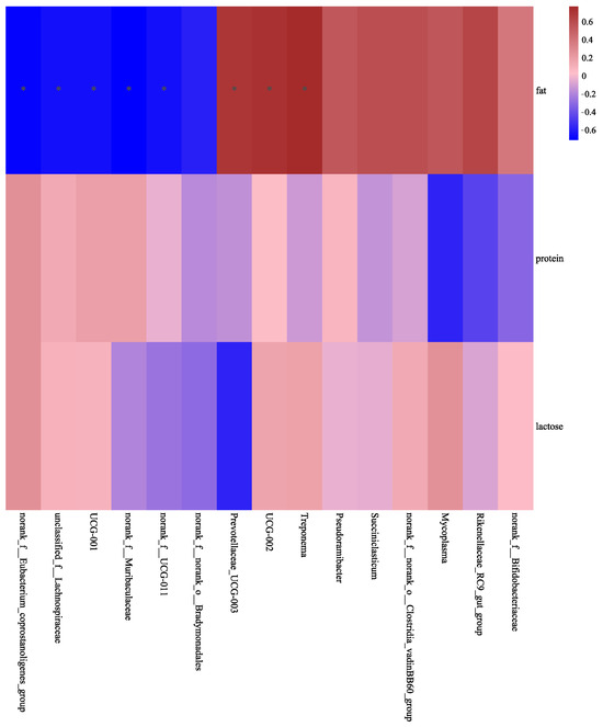 Correlations between differential bacteria and milk composition in the control (CON) and high-dose conjugated linoleic acid (H-CLA) groups. The color code indicates the direction of the correlations (red indicates a positive correlation and blue indicates a negative correlation); * p < 0.05.
