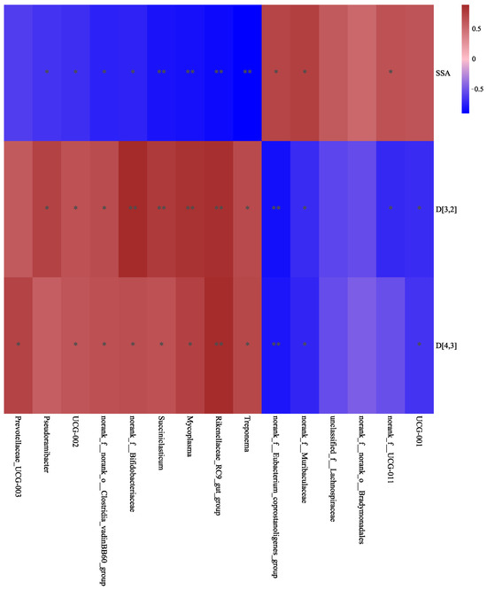 As depicted in Figure 8, MFG size (D[3,2], D[4,3],) was negatively correlated with the relative abundance of unclassified_f__Lachnospiraceae, norank_f__UCG-011, UCG-001, and norank_f__Eubacterium_coprostanoligenes_group in Firmicutes and norank_f__Muribaculaceae in Bacteroidetes and positively correlated with the relative abundance of Mycoplasma, Succiniclasticum, norank_f__norank_o__Clostridia_vadinBB60_group, and UCG-002 in Firmicutes; Treponema in Spirochaetota; and Rikenellaceae_RC9_gut_group in Bacteroidetes. Meanwhile, the SSA was positively correlated with the relative abundance of norank_f__UCG-011, norank_f__Muribaculaceae, and norank_f__Eubacterium_coprostanoligenes_group, but negatively correlated with that of Succiniclasticum, norank_f__norank_o__Clostridia_vadinBB60_group, UCG-002, Treponema, Rikenellaceae_RC9_gut_group, Pseudoramibacter, and norank_f__Bifidobacteriaceae.