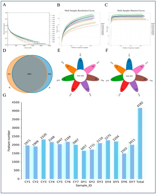 Feasibility analysis of sequencing data (healthy: CY; diarrheic: DY). The sequencing depth and evenness of fecal flora can be assessed using sparsity (A,B) and grade abundance curves (C). The distribution of OTUs in intestinal bacteria from different samples is represented by (D–F). Additionally, the number of OTUs in the sample can also be determined (G).