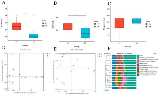 Comparative analysis of intestinal flora α and β diversity between healthy (group: CY) and diarrheic (group: DY) Przewalski’s horses. (A–C) Chao, ACE, and Shannon indices, respectively. (D,F) PCoA plots based on (E) weighted UniFrac distance and (F) unweighted UniFrac distance. (F) Cluster analysis plot (* p ≤ 0.05,*** p ≤ 0.001).