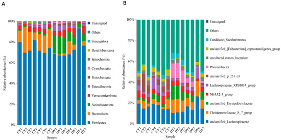 Proportions of (A) phylum and (B) genus of predominant bacteria in healthy and diarrheic horses (healthy: CY; diarrheic: DY).
