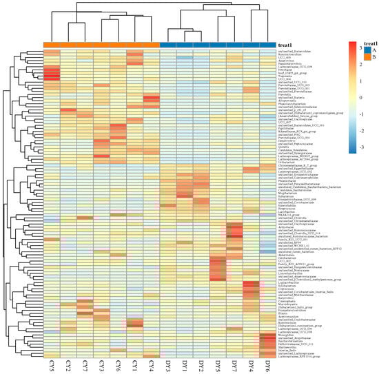 Heatmaps of genus–level clustering of microbial communities in healthy (Group A) and diarrhea (Group B) Przewalski’s horses.