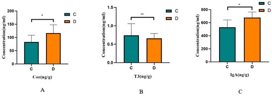 Comparison of hormone differences between diarrhea (Group D) and healthy (Group C) groups. (A) Cortisol; (B) triiodothyronine (T3); (C) immunoglobulin IgA (*, p ≤ 0.05, ns, p > 0.05).
