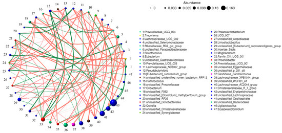 The results showed that Eubacterium was positively correlated with Candidatus_Saccharimonas (0.9164) and Mogibacterium (0.8769). Lachnospiraceae_ND3007_group was positively correlated with Lachnospiraceae_AC2044_group (0.8329) and Oribacterium (0.8329), Prevotellaceae_UCG_004 (0.9076), [Eubacterium]_coprostanoligenes_group (0.8549), p_251_o5 (0.8593), and Synergistaceae (0.8945). Limosilactococcus was positively correlated with Ligilactobacillus (0.8461) and Phoenicibacter (0.8329). Phascolarctobacterium was positively correlated with [Eubacterium]_ruminantium_group (0.8681) and Ruminococcus (0.8373). Quinella was positively correlated with Lachnospiraceae_AC2044_group (0.8769), Oribacterium (0.8769), Synergistaceae (0.8241), and Pseudobutyrivibrio (0.832) (Figure 7).