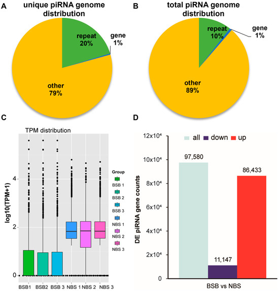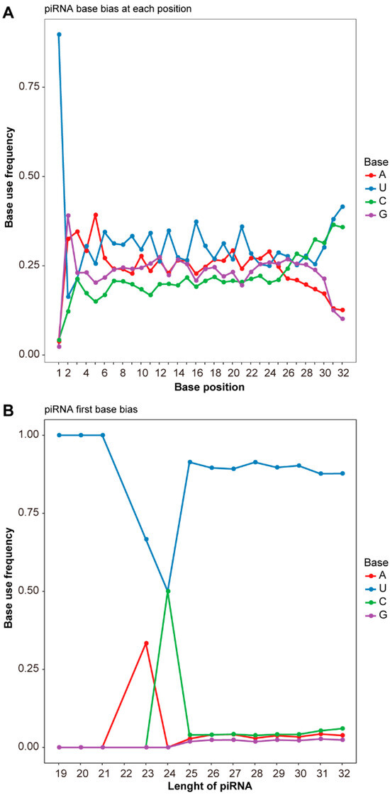 Three testes close to the mean weight were selected from the BSB (0.118 ± 0.002 g) and NBS (0.037 ± 0.001 g) groups [19]. Raw RNA data were filtered, perfectly mapped reads were retained, and labels were removed. Reads with 1 U or 10 A were considered as candidate piRNAs (Supplementary S1).