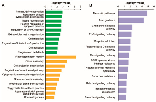 GO analysis identified the most 10 significantly enriched functions in the downregulated target mRNAs of DE piRNAs between the BSB and NBS groups. These processes included protein ADP-ribosylation, regulation of actin cytoskeleton organization, tissue regeneration, positive regulation of apoptotic processes, regulation of the MAPK cascade, extracellular matrix organization, cell migration, regulation of interleukin-6 production, cell adhesion, and programmed cell death (p < 0.05). Similarly, the top 10 enriched biological processes with upregulated target mRNAs included flagellated sperm motility, cilium assembly, cell projection organization, regulation of smoothened signaling pathway, cytoplasmic microtubule organization, sperm axoneme assembly, intracellular signal transduction, triglyceride biosynthetic process, regulation of ARF protein signal transduction, and spermatogenesis (p < 0.05; Figure 4A).