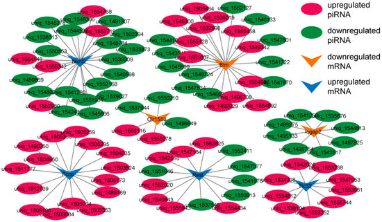 piRNA–mRNA regulatory network in the testes of plateau zokors. The red ellipse represents an upregulated piRNA associated with the target mRNA, while the green ellipse represents a downregulated piRNA associated with the target mRNA.