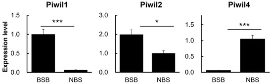 Relative mRNA expression for the PIWIL gene family measured using qPCR in plateau zokor testes. * indicates a significant difference between the two groups, with * representing p < 0.05 and *** representing p < 0.001.