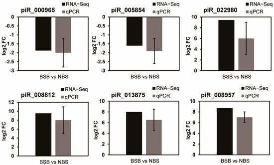 qPCR validation of the piRNA-seq data. The black bars represent the relative expression levels of piRNA in transcriptome sequencing, while the gray bars represent the relative expression levels of piRNA after qPCR validation.