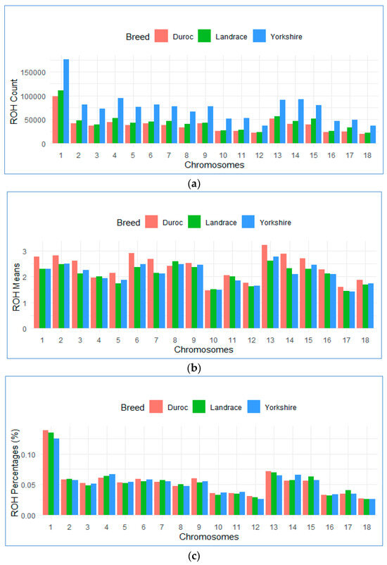 Bar plot for autosomal chromosome across the three breeds. (a) number of ROH counts per chromosome; (b) means of the ROH count for each chromosome (c) percentage of ROH for each autosomal chromosome.