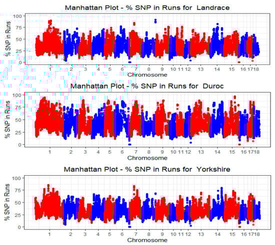 Across all three breeds, SSC1 consistently showed the highest number of ROHs. Duroc has a total count of 97,815 ROHs (covering 14.31% of the chromosome). Landrace breeds had 110,018 ROHs (14.05% coverage), and Yorkshire breeds had the highest count of 175,188 ROHs (13.12% coverage), suggesting that SSC1 is the largest chromosome and harbors more ROH and markers across the pig genome. The Manhattan plot analysis in Figure 2 also reveals that the Duroc, Landrace, and Yorkshire breeds all had a higher percentage of homozygosity (ROH) in SSC1. Conversely, SSC18 had the smallest number of ROHs and percentage coverage among all breeds: Duroc (19,252), Landrace (21,610), and Yorkshire (36,265), indicating a smaller number of markers across the genome.
