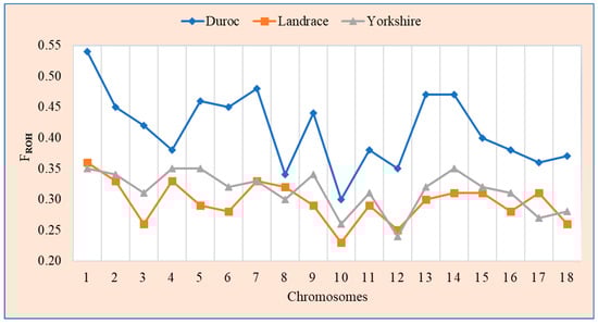 Line plot of chromosome−wide inbreeding coefficient (FROH) for each autosomal chromosome across three distinct pig breeds. The FROH statistic measures inbreeding by determining the proportion of the genome that is homozygous owing to the recent common ancestry.