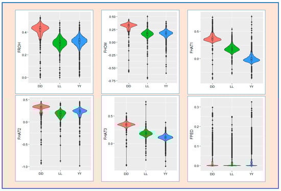 Figure 3 presents a line plot of the chromosome-wide inbreeding coefficient based on ROH (FROH) for 18 autosomal chromosomes across the three distinct genotypes. The results indicate that the Duroc breed has higher values for FROH at each chromosome level than the Landrace and Yorkshire breeds do. The violin plot of the distribution of genomic and pedigree inbreeding coefficients presented in Figure 4 indicates that the Duroc breed had higher values for all genomic and pedigree inbreeding coefficients than the Landrace and Yorkshire breeds.