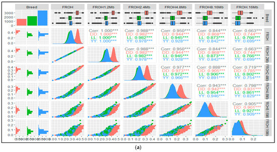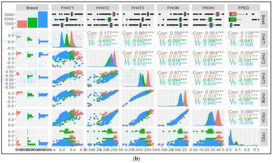 Scatterplots (lower panel) and correlations (upper panel) for three genotypes: (a) total genomic inbreeding coefficients (FROH) and by class (FROH1–2Mb, FROH2–4Mb, FROH4–8Mb, FROH8–16Mb, and FROH>16Mb); (b) five different genomic inbreeding coefficient estimators and pedigree inbreeding coefficients (FPED). FROH: total inbreeding coefficient based on ROH; FHOM: inbreeding coefficient based on the observed vs. expected number of homozygous genotypes; FHAT1: inbreeding coefficient based on the variance of additive genotype values; FHAT2: inbreeding coefficient based on excess homozygosity; FHAT3: inbreeding coefficient based upon the correlation between uniting gametes; DD: Duroc; LL: Landrace; and YY: Yorkshire; **: Significant at p < 0.01; ***: Significant at p < 0.001.