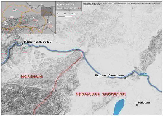 Topographic map with sites mentioned in the text and Roman provinces; source: EPSG:3857 WGS 84/Pseudo-Mercator|Dominik Hagmann|Data: Land Oberösterreich; Ancient World Mapping Center; Natural Earth; European Environment Agency/Copernicus|2 August 2024.