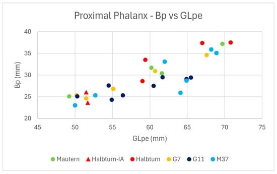 Bivariate scatterplot of proximal cattle phalanges used in this study, based on proximal breadth (Bp) and greatest peripheral length GLpe).