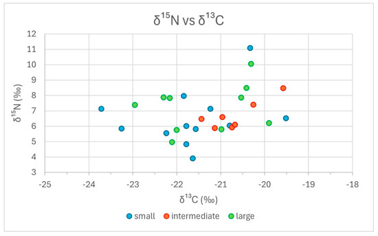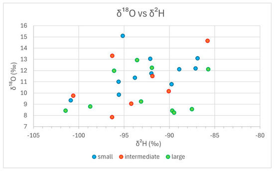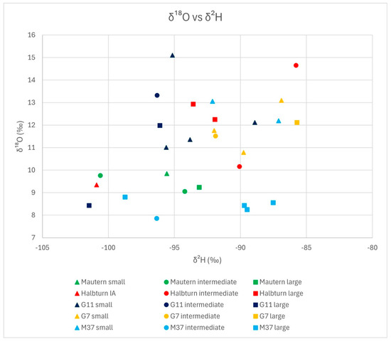In Figure 3 and Figure 4, we grouped the results from stable isotope analyses as bivariate scatterplots, according to the three size classes, by δ15N vs. δ13C and δ18O vs. δ2H. Neither plot reveals a consistent tendency of any size group regarding stable isotope composition. In Figure 3 (δ15N vs. δ13C), the extreme outer positions on all four sides are occupied by representatives of the small group, which exhibit an overall larger variability. Intermediate specimens are limited to the centre-right area of the distribution, with δ13C values over −21.5‰ and δ15N values between ca. 6‰ and 8.5‰. This reduced variability could either correspond to an artefact of the division criteria for the groupings or it could be caused by the influence of sites, where three locations, i.e., Mautern, Halbturn, and G11, are dominant within this size class. In Figure 4 (δ18O vs. δ2H), all size groups, including the intermediate specimens, appear to be distributed across the whole scatter. In the lower part of the diagram, with δ18O values less than 9‰, only large and intermediate specimens are represented. Small specimens are more frequent among higher δ18O values. The difference in δ18O values between small and large specimens is also the only one that proved statistically significant. However, it is mainly based on the good representation of Mautern and M37 in the lower part of the diagram. Regarding δ2H values, there is no discernible trend.