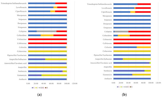Percentage antimicrobial susceptibility profiles for (a) E. coli isolated from antibiotic-using farms and (b) E. coli isolated from nonantibiotic-using farms (S: susceptible, I: intermediate, SDD: susceptible-dose dependent, and R: resistant).