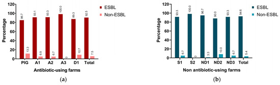 Phenotypic detection of ESBL-producing-E. coli isolates in (a) antibiotic-using and (b) nonantibiotic-using pig farms.