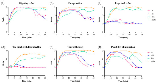 Frequencies for all reflexes by drugs over time for 11 common blue-tongued skinks. (a) The loss of righting reflex was observed in all skinks except one skink which was given dexmedetomidine-midazolam (DM). (b) The complete loss of the escape reflex in all 11 skinks was only achieved in alfaxalone-dexmedetomidine-midazolam (ADM). Most of the skinks receiving alfaxalone (A) or alfaxalone-midazolam (AM) maintained their (c) palpebral reflexes and (d) toe pinch withdrawal reflexes. (e) The complete loss of tongue flicking was found in DM and ADM, and (f) the possibility of intubation was highest in ADM followed by AM and A.