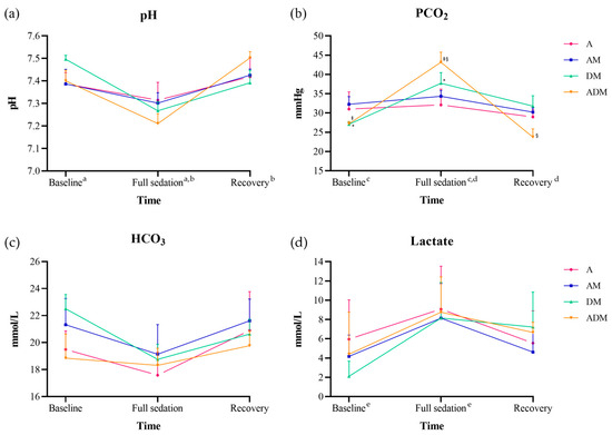 There were significant differences in pH, PCO2, and lactate over time (all p < 0.001; Figure 3; Supplementary Table S1). For pH and PCO2, values at the time of full sedation were significantly lower and higher, respectively, from baseline and recovery values (all p < 0.001); lactate was only found to be significantly higher at full sedation compared to baseline (p < 0.001). The lactate was increased at recovery but was not statistically significant from baseline (p = 0.054). A significant difference for the interaction drug × time was only found for PCO2 (F = 3.2, p = 0.008). When analyzing by each drug, DM showed differences between baseline and full sedation (p = 0.023), and ADM at full sedation demonstrated a significantly higher value from baseline and recovery (all p < 0.001).
