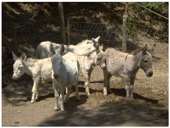All animals had free access to spontaneous pasture during the day. During the nighttime, they were sheltered in the barn. Feeding practices consisted of the administration of forage (hay) and of compound mixed feed for horses at maintenance, consistently with an estimation of the body condition of the donkeys. All the donkeys are kept as companion animals.