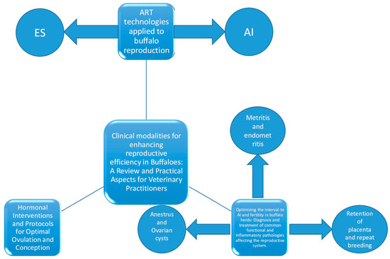 Figure 1. Diagram of clinical approaches in buffalo reproduction. The clinical approach to buffalo reproduction allows for the management of reproduction from three perspectives: control and induction of ovulation, ART techniques such as ES and AI, and control of major reproductive pathologies.