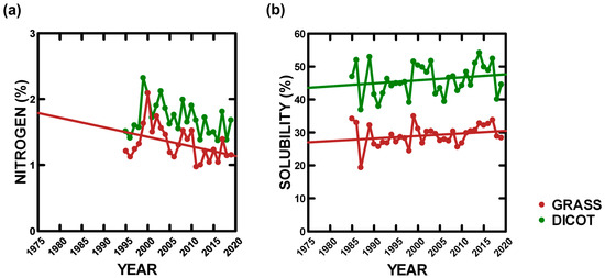 Annual grass and dicot nutritional characteristics averaged across all sites: (a) nitrogen and (b) solubility. Statistically significant linear trend lines are provided (Table 1).