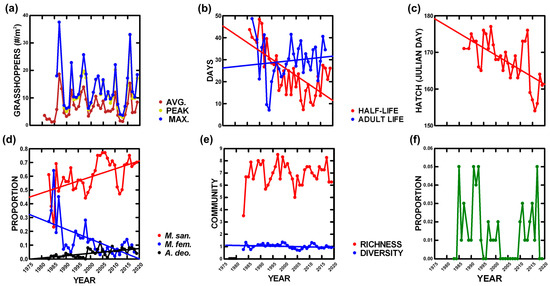 Annual grasshopper measurements averaged across sites with statistically significant linear trends (Table 2): (a) average, peak, and maximum density, (b) days to attain 50% mortality (half-life) and 50% adults (adult life) in the population, (c) hatching date, (d) relative abundance of three common species, (e) species richness and diversity, and (f) proportion of grasshoppers in the spring community.