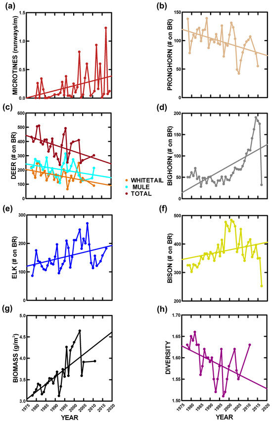 Annual mammalian herbivore measurements with statistically significant linear trends (Table 3): (a) microtine runway densities, (b) pronghorn numbers, (c) deer numbers, (d) bighorn sheep numbers, (e) elk numbers, (f) bison numbers, (g) ungulate biomass density, and (h) ungulate diversity.