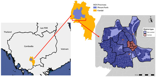 Locations of the provinces included in the MDV campaign and Working Zones and the location of campaign hubs (orange markers) in Phnom Penh Province. Polygons within the district border describe the Working Zones.