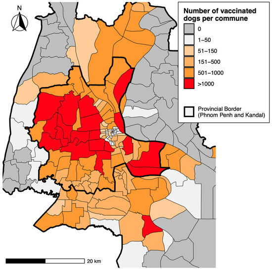 The vaccination teams encountered a total of 89,285 dogs during the 10 working days, 74,983 (84.0%) of which were vaccinated against rabies. Owners reported that 1795 dogs (2.4%) had been vaccinated recently (no time specified). Of the 74,983 doses of vaccine administered to dogs, 55,578 (76.2%) were delivered in Phnom Penh Province, and 19,405 were delivered in Kandal Province. Figure 2 shows the distribution of dog vaccines at the commune level. An additional 2145 cats were also vaccinated during the campaign, meaning that the total number of rabies vaccine doses delivered to dogs and cats was 77,128.