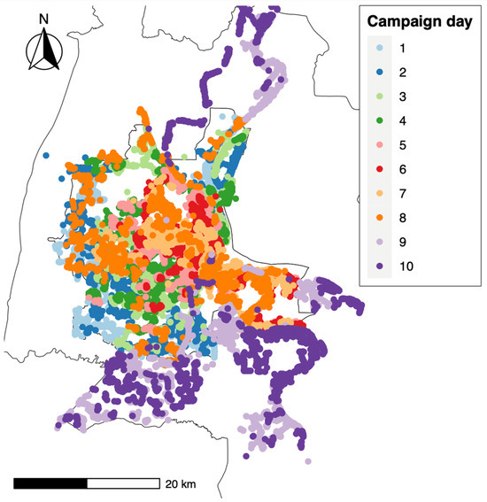 Map of campaign region with points representing the GPS location of dog vaccinations colored by the day of vaccination to show the daily geographic progression of the vaccination workforce.