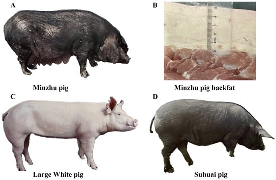Pig breeds used in this study. (A) Minzhu pig (MZ). (B) Back fat of MZ at the last rib. (C) Large White (LW) pig. (D) Suhuai (SH) pig.